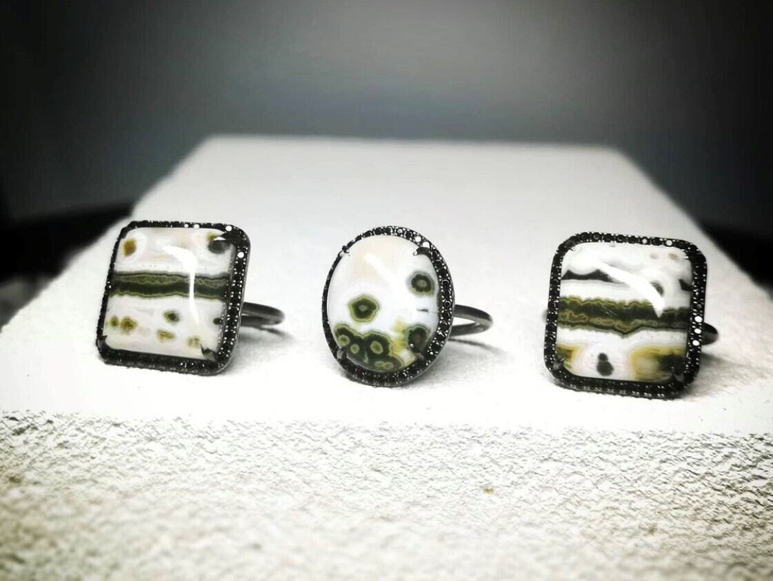 オーシャンジャスパーが素敵なブラックメッキピアス。とても個性的なシリーズです。シリーズでペンダントトップ、スクエアリング、オーバルリングもございます。シリーズのペンダントトップになります。お手持ちのチェーンで色々とお楽しみ下さい。シリーズで、ピアス、スクエアリング、オーバルリングもございます。