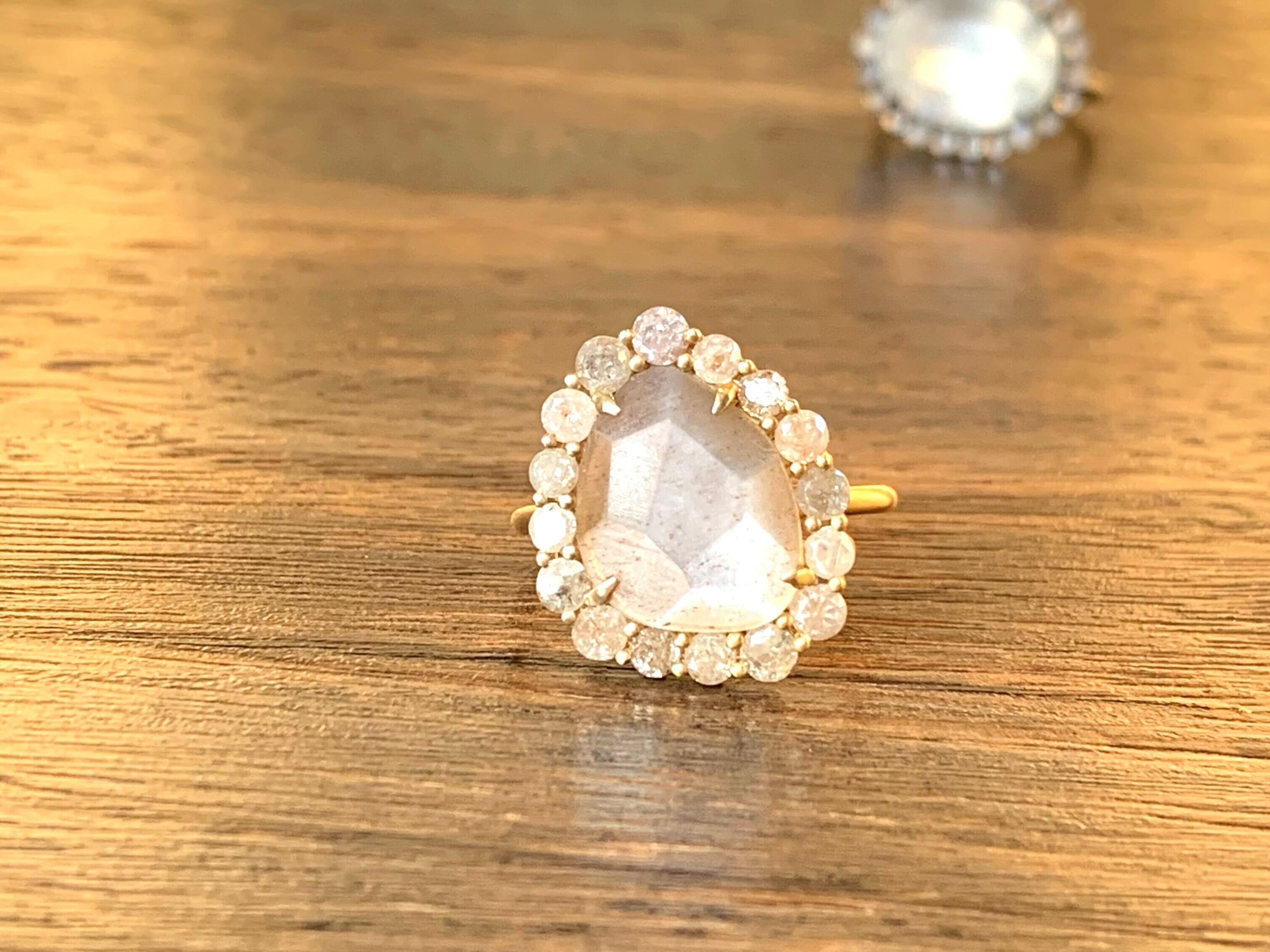 ローズカットの大きなムーンストーンに、ミルキーダイヤをふんだんにあしらった美しいリングです。