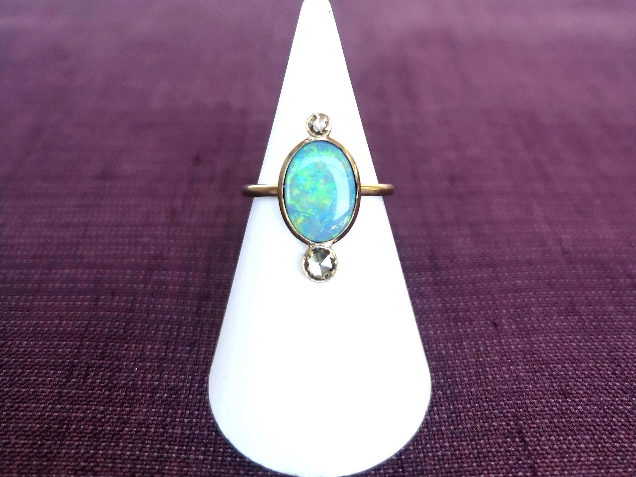 明るく華やかなブラックオパールのリングにローズカットのブラウンダイヤを合わせました。ダイヤの位置が個性的な1点物になります。