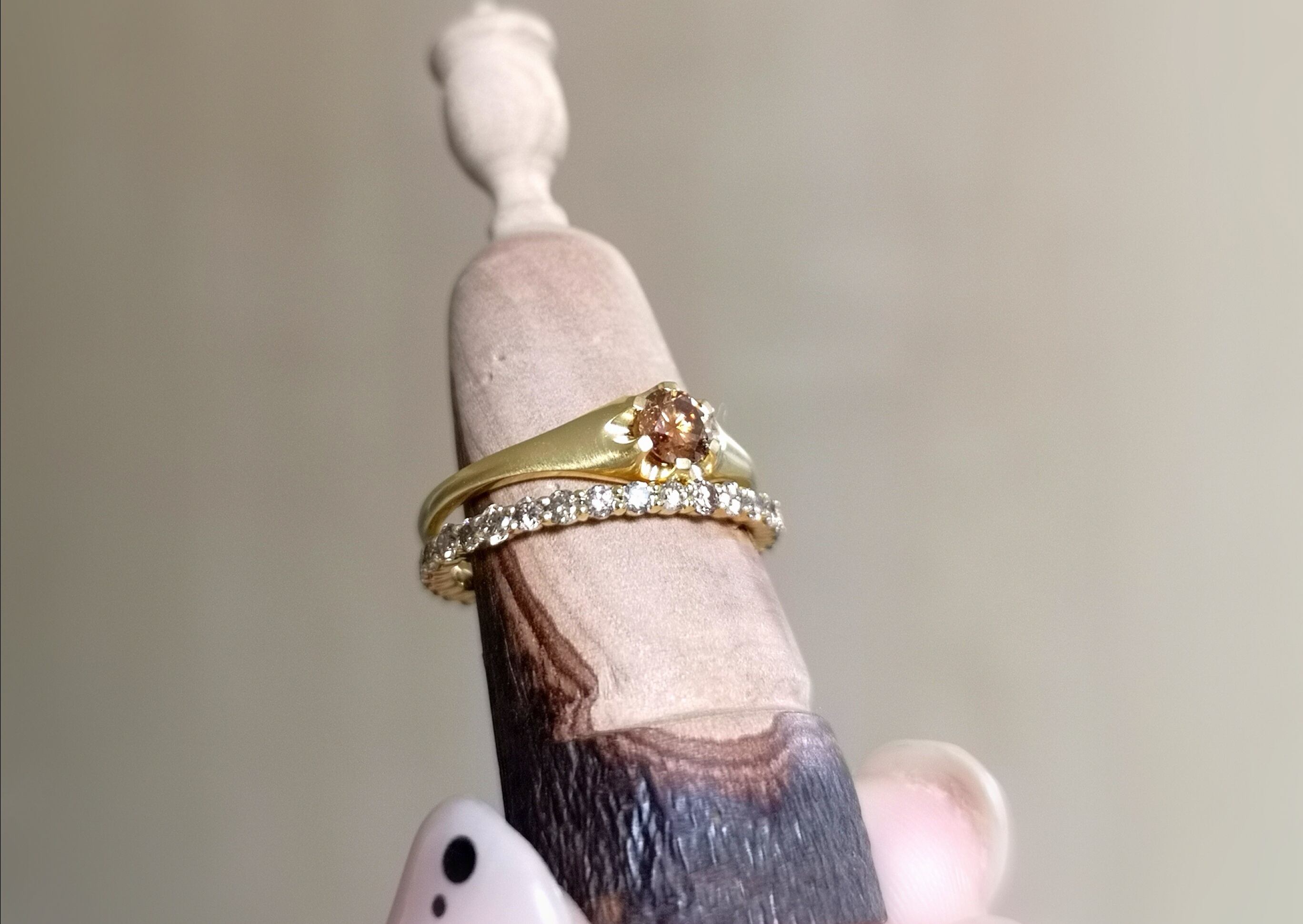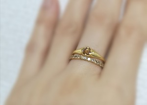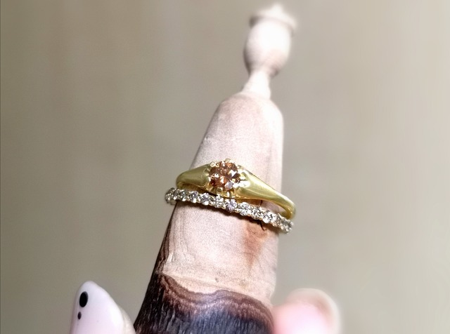 100100300003 コニャックカラーダイヤモンドリング コニャックカラーが魅力のダイヤモンドリングです。マット加工を施した地金との相性が良く、 アンティーク感が素敵なジュエリーです。 素材 ダイヤモンド 0.28ct 地金 k10yg/マット加工 サイズ #11 ※金種の刻印あり/石目の刻印あり ※天然石を使用しているため内包物、クラック等が見受けられる場合がございますが、特徴として ご了承下さい。