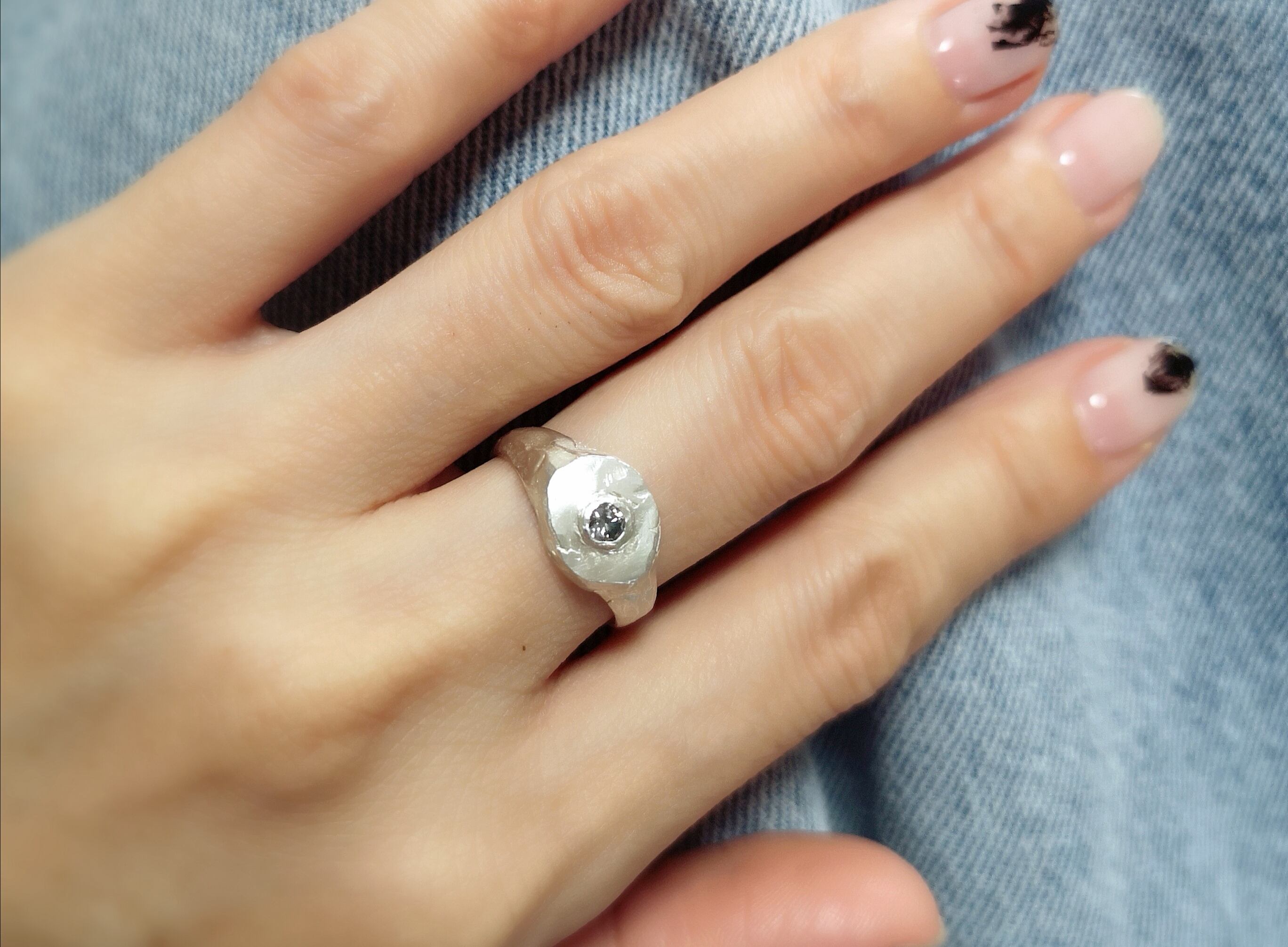 100100300058 ダイヤモンド シグネットリング S 素材:ダイヤモンド 0.18ct silver925 #13 総重量:3.950g 金種、石目の刻印あり グレーダイヤモンドをあしらったシグネットリングです。パープルブルーグレーの様な個性的なダイヤモンドとラフなデザインのリングが神秘的なジュエリーです。 ※天然石を使用しているため、内包物・クラック等が見受けられる場合がございますが、特徴としてご了承ください。