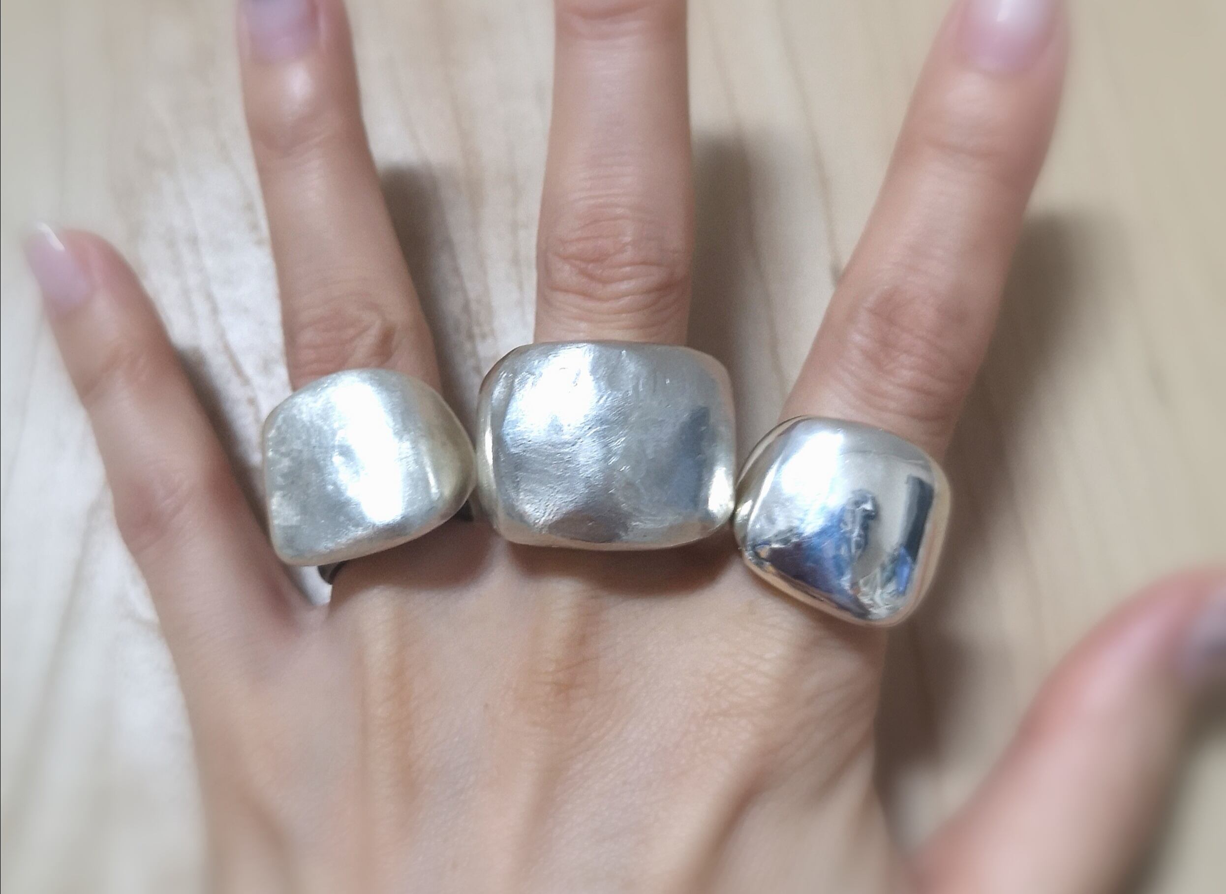 100100300063 シルバーリング シャイニー 素材:silver999 金種刻印あり シャイニーで煌めきあるsilver999リングは、素材を楽しみ個性を育てる事でオンリーワンの味わいをお楽しみ頂きたいリングです。とってもボリューミーでありながら、着け心地良く仕上がっております。 ※天然石を使用しているリングは、内包物・クラック等が見受けられる場合がございますが、特徴としてご了承ください。