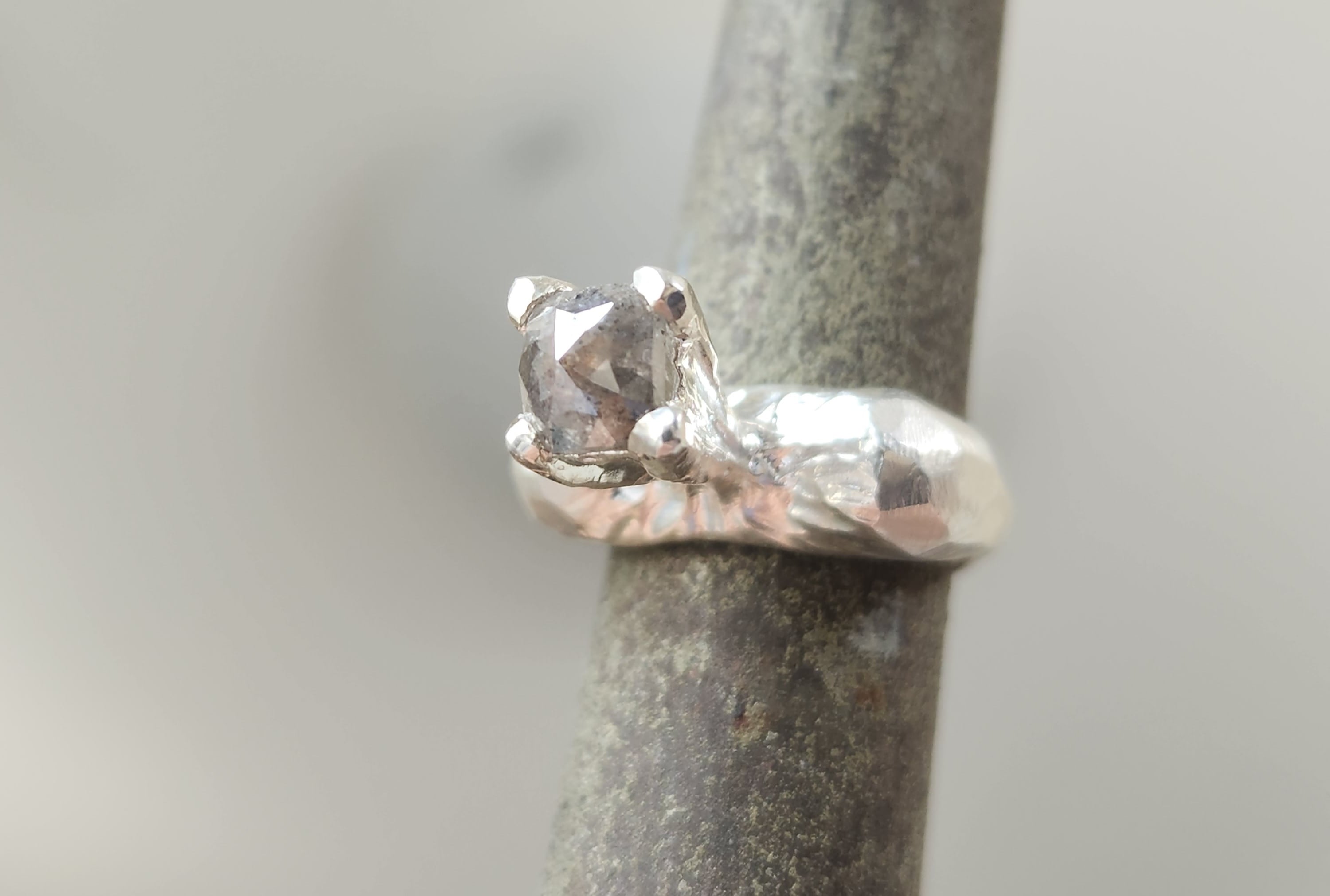 100100300107 素材:silver925 ダイヤモンド1.28ct #13 金種石目刻印あり ソルト&ペッパーダイヤモンドを高さのある超個性的な立て爪リングにセッティング。 芸術的であり圧巻のデザインです。 ※天然石を使用しているリングは、内包物・クラック等が見受けられる場合がございますが、特徴としてご了承ください。